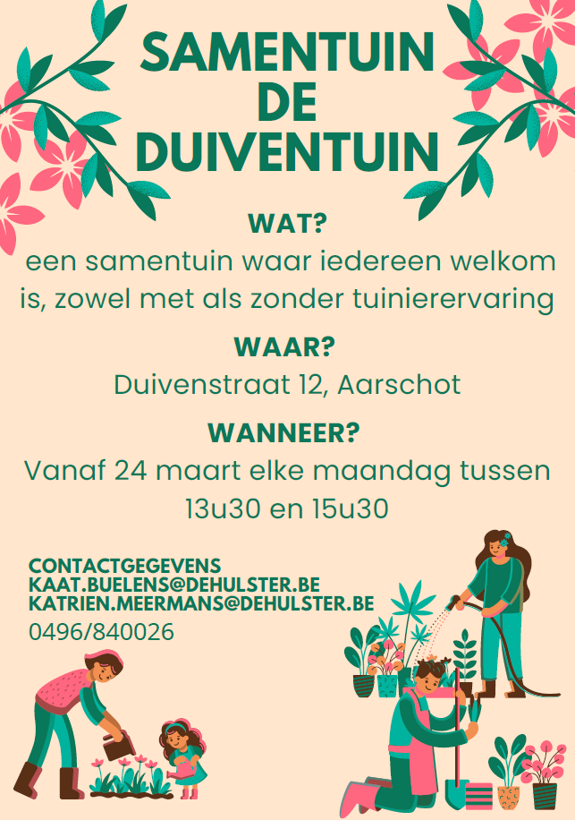 De Duiventuin is een samentuin waar mensen uit de buurt terecht kunnen om samen te tuinieren of te genieten van deze plek. We proberen met diverse talenten aan de slag te gaan. Zo zal de ene meer voelen voor het echte tuinieren, de andere om er een gezellig plekje van te maken en de natuur te bewonderen. Het gaat om een echte samentuin. We maken samen een plan voor de tuin die we samen onderhouden.
