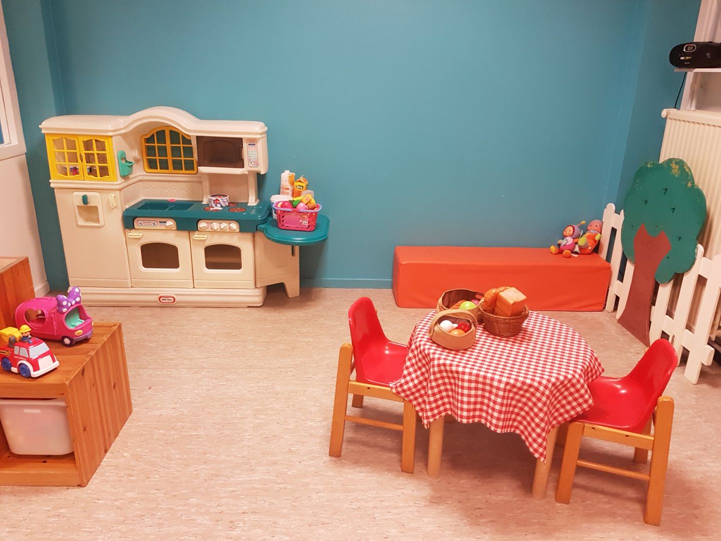 De peutergroep wordt overdag nog eens onderverdeeld in 2 kleinere groepen waardoor we makkelijk klassikale activiteiten met onze kindjes kunnen doen. We werken met een vaste groep kinderbegeleidsters die elk verantwoordelijk zijn voor hun eigen leefgroep. Naast de spellokalen hebben we ook een afgesloten tuin waar de kinderen naar hartelust kunnen spelen bij mooi weer.
